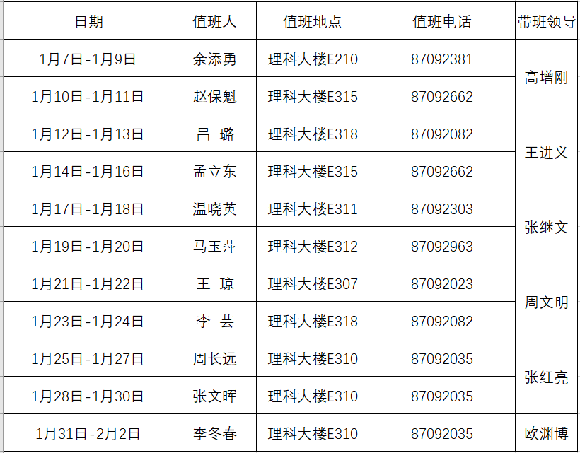 寒假值班安排