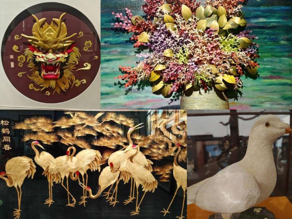 8月5日,团队来到袁月英麦草画工艺品有限公司。经省级传承人,国际高级民间工艺美术师袁月英介绍,家传自清代曾祖父袁海臣制作麦草画,至今已传承百年,麦草画以小麦秸秆为原料,通过冲、泡、熨、刮、粘、剪、刻、烫、烙等十几道工序手工制作而成,作品古朴典雅被誉为“中华一绝,民间瑰宝”。袁老师坦言:“学麦草画不是那么简单,光这个培训的过程就需要几年的时间,比如做花卉、做山水、做花鸟,都是需要你用心去学,过程非常漫长,要坐下来,沉下心,可能是其他手艺很难达到的难度。”