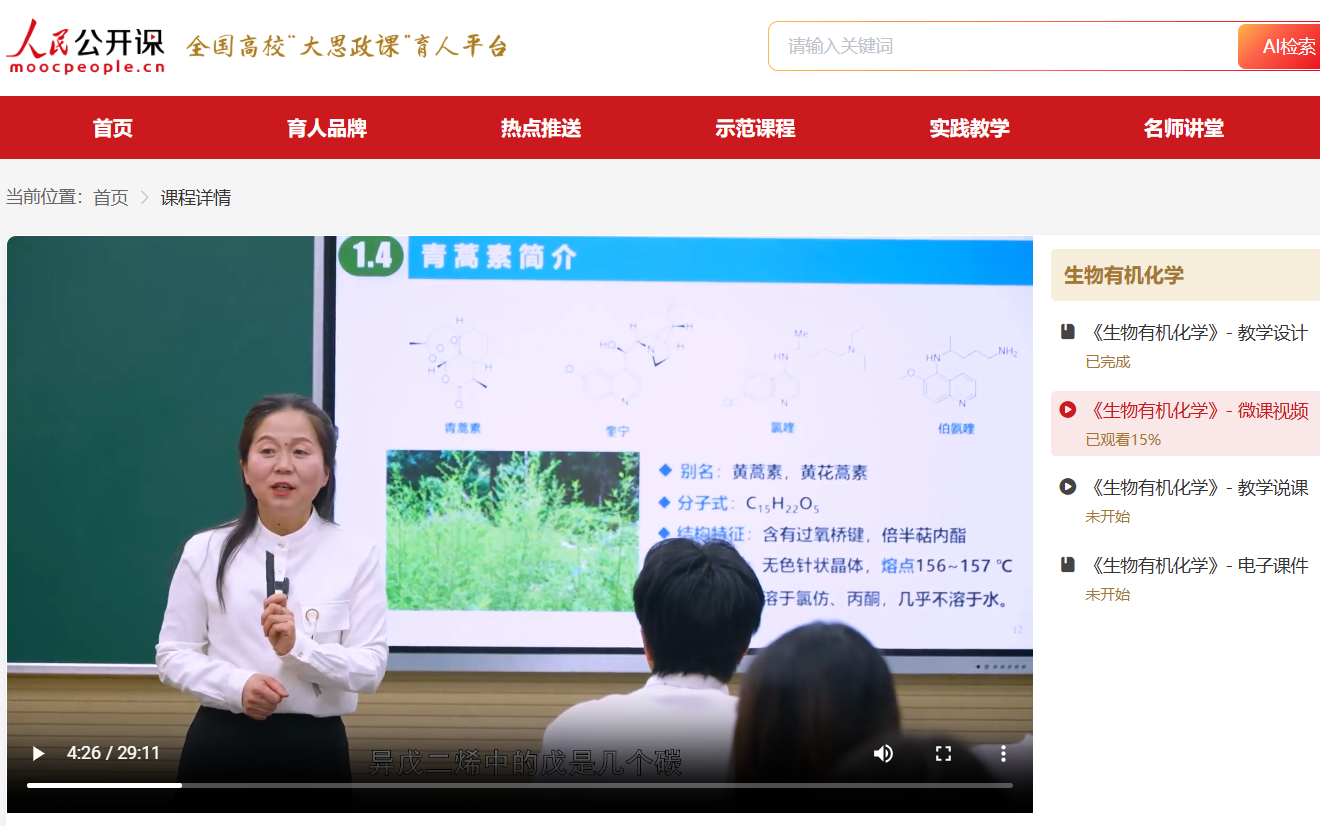 该课程已于4月份入选人民网公开课,累积学习人数5841人。该课程连续入选国家级教育平台,既是亚洲av 重视思政课程建设的重要体现,也是落实立德树人根本任务的喜人成果。今后,亚洲av 将持续深化课程思政建设,强化“农化融合”特色,构建高质量人才培养体系,培养更多知农爱农的卓越化学人才,为建设农业强国、推进中国式现代化作出新的贡献。