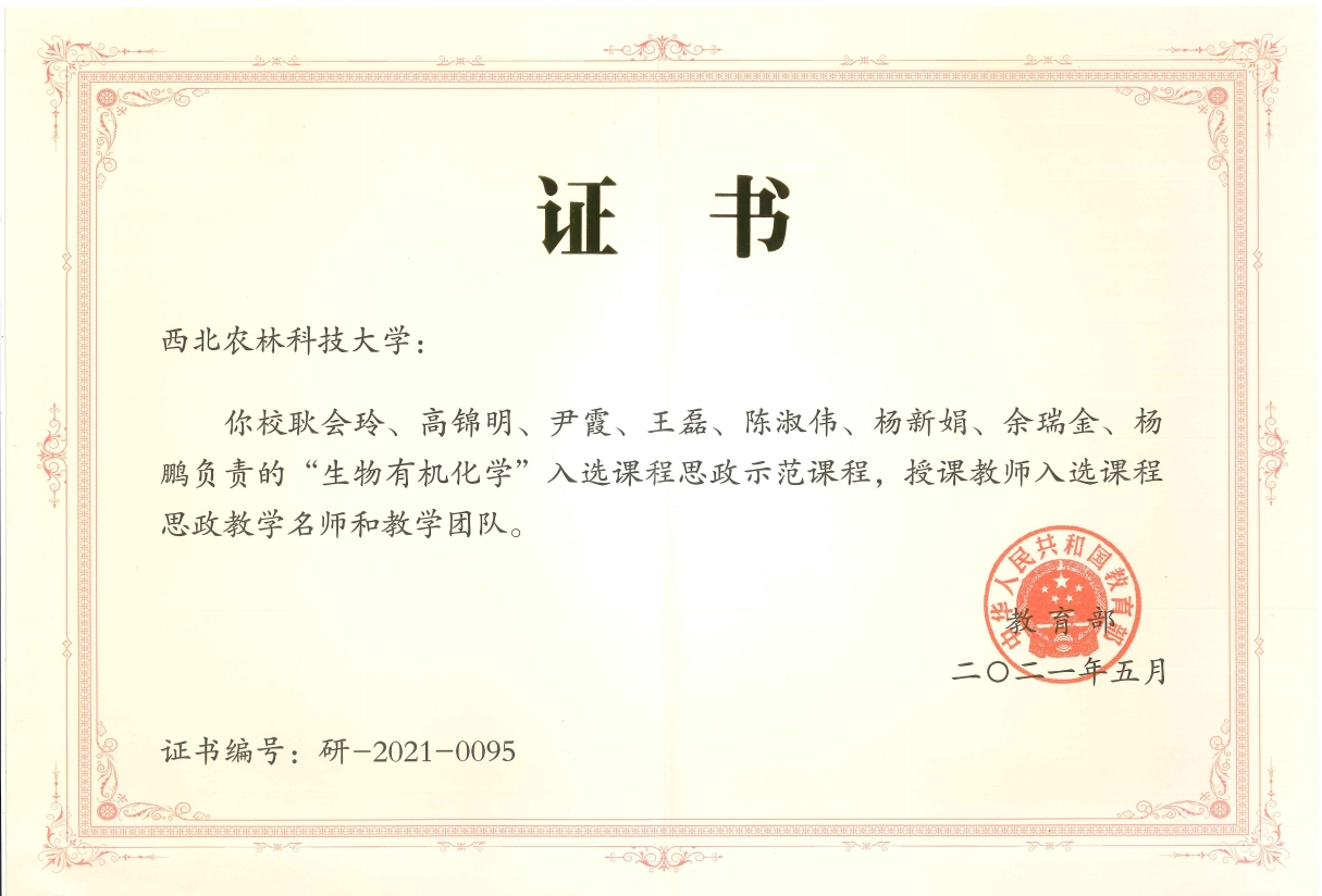 《生物有机化学》课程于2021年入选“首批国家课程思政示范课程”、学校精品示范课、学校教材建设重点项目,教学团队获评“国家课程思政教学团队”,耿会玲教授和团队成员获评“国家课程思政教学名师”,教学案例——青蒿素及其衍生物研究进展入选“陕西省教学案例”。