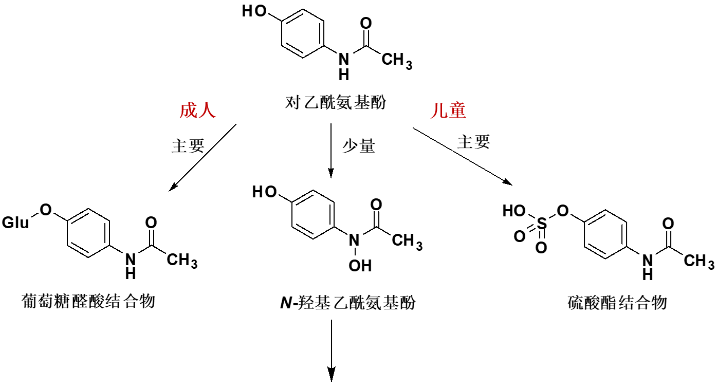 结论:长期或大剂量服用时,对乙酰氨基酚的代谢物-乙酰亚胺醌会耗尽肝脏中的谷胱甘肽,进一步与肝、肾蛋白及酶不可逆结合,引起肝坏死、肾衰竭等。含巯基的药物是对乙酰氨基酚中毒的解毒剂。