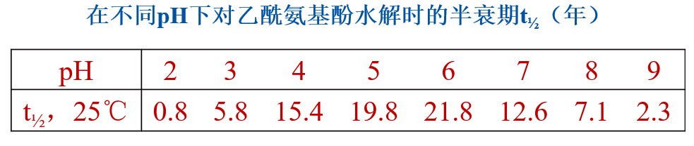呈现:在不同pH下对乙酰氨基酚水解时的半衰期及其水解和氧化过程。